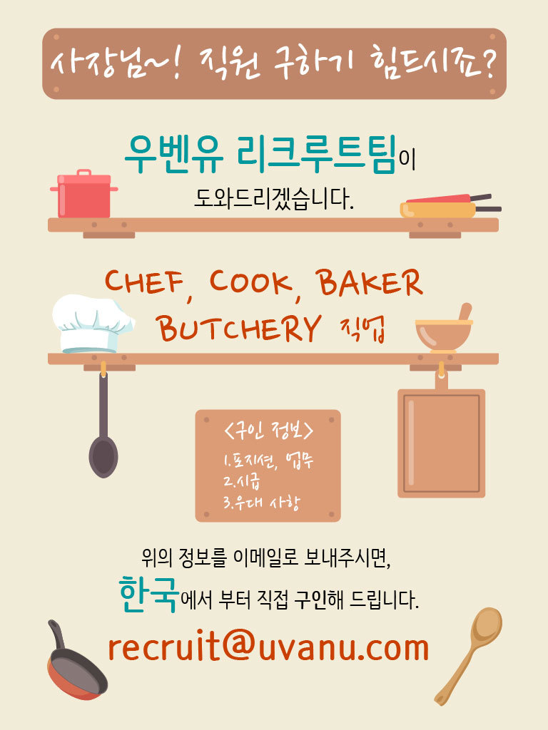 쿡 쉐프 베이커 등 필요하신 포지션에 대한 구인정보를 위의 메일로 보내주시면 최선을 다해서, 도와드리겠습니다.