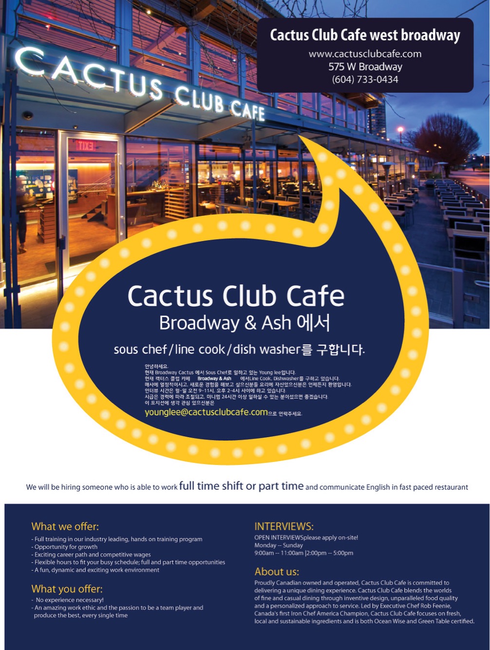이 포지션에 생각 잇으신분은 younglee@cactusclubcafe.com 으로 RESUME 를 보내주세요.