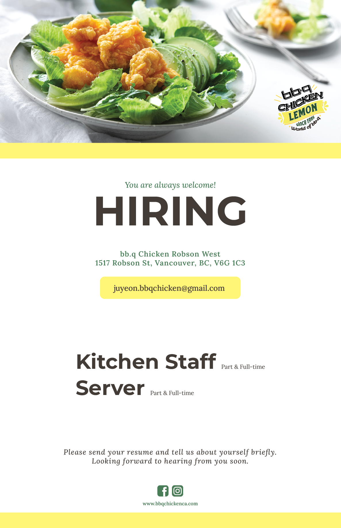 ⚡️BBQ CHICKEN Robson점 함께하실 분 모집합니다!⚡️ 작성자BBQ Chicken Canada|작성시간22.02.05|조회수201 목록 댓글 0 글자크기 작게가 글자크기 크게가 ㅤㅤ새롭게 시작하는 BBQ CHICKEN Robson West점에서 함께하실 분을 모집합니다! 모집 분야: Kitchen Staff / Server (Full or part time) 경력무관/직원 할인 20%제공/ 유동적 스케줄!(필요시 LMIA지원 가능) 관심있으신 분은 juyeon.bbqchicken@gmail.com으로지원분야/간단한 자기소개/ 비자상태/ 간단한 이력서 보내주시기 바랍니다! ㅤㅤㅤㅤㅤㅤㅤㅤㅤㅤㅤㅤㅤㅤ 다음검색 현재 게시글 추가 기능 열기 북마크 공유하기 신고 센터로 신고 댓글 댓글 0 댓글쓰기 답글쓰기 댓글 리스트