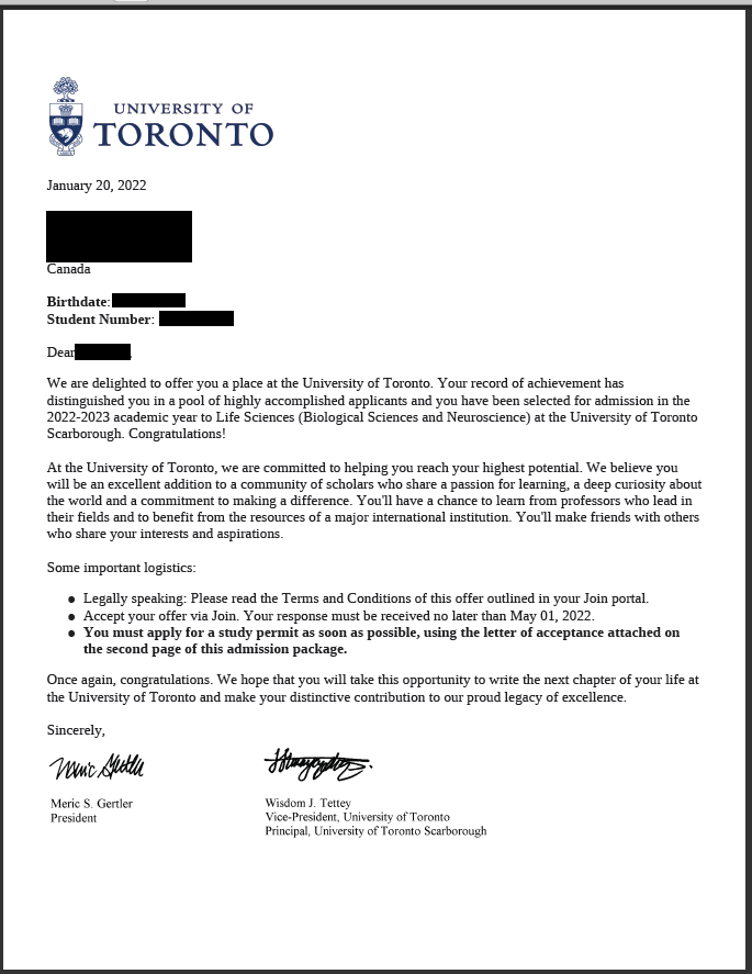 UT (University of Toronto) 지원하신 저희 학생분의