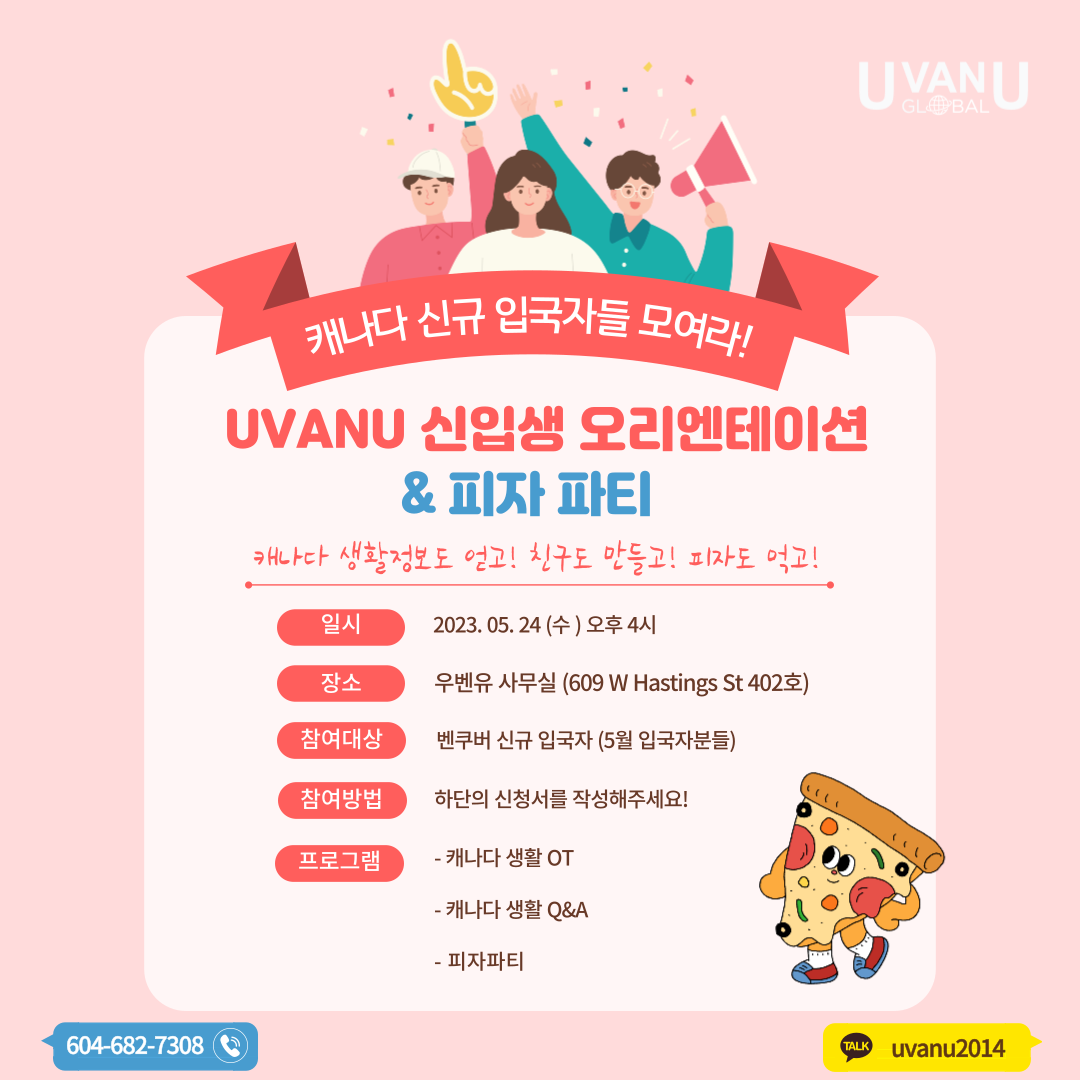 오셔서 벤쿠버 생활에 대한 꿀팁 얻어가시고! 친구도 만들어가시고! 우벤유에서 제공하는 피자도 즐기고 가세요!!