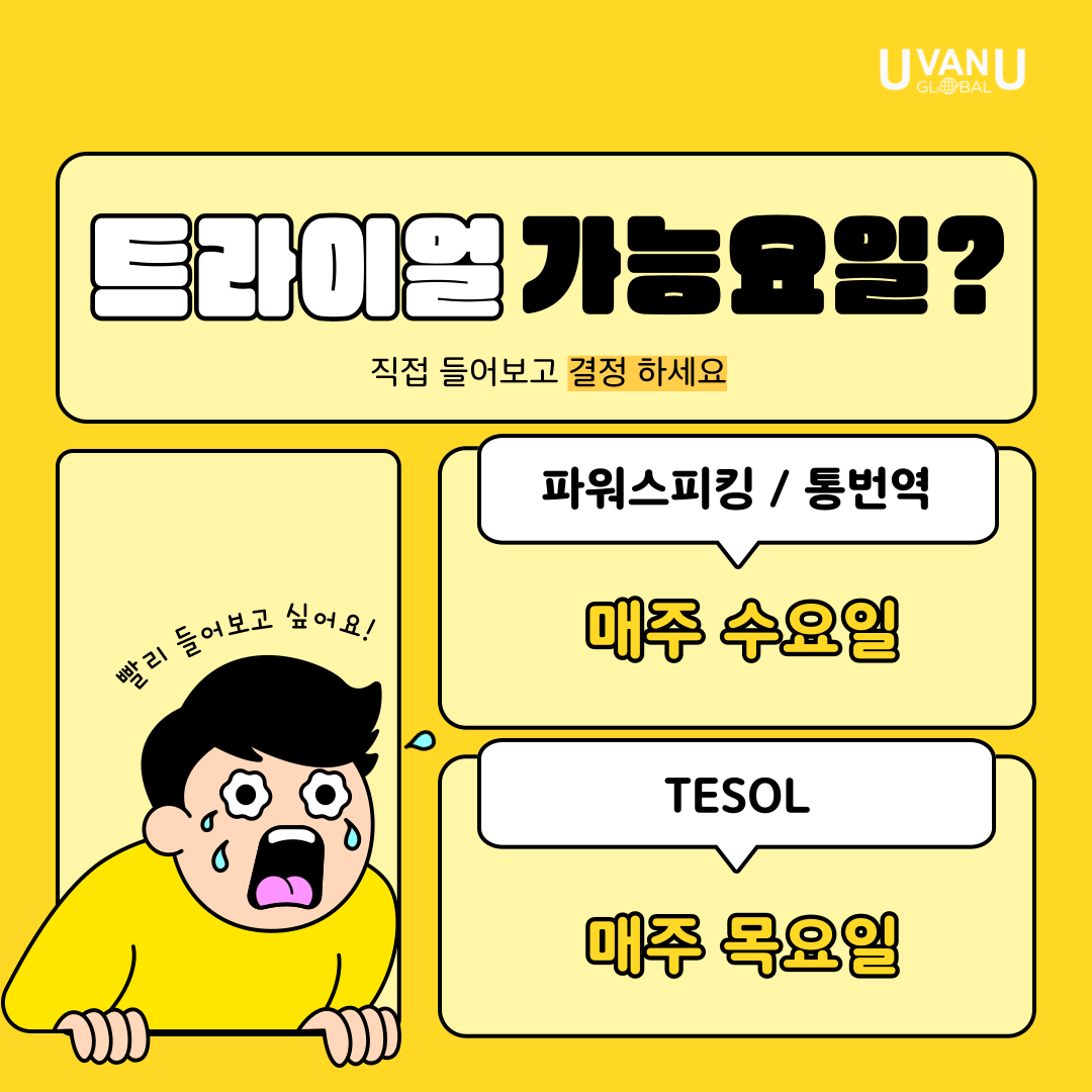 걱정하지마세요! 우벤유에서 매주 수,목요일에 무료 트라이얼 레슨을 받을 수 있는 기회를 준비했습니다!
