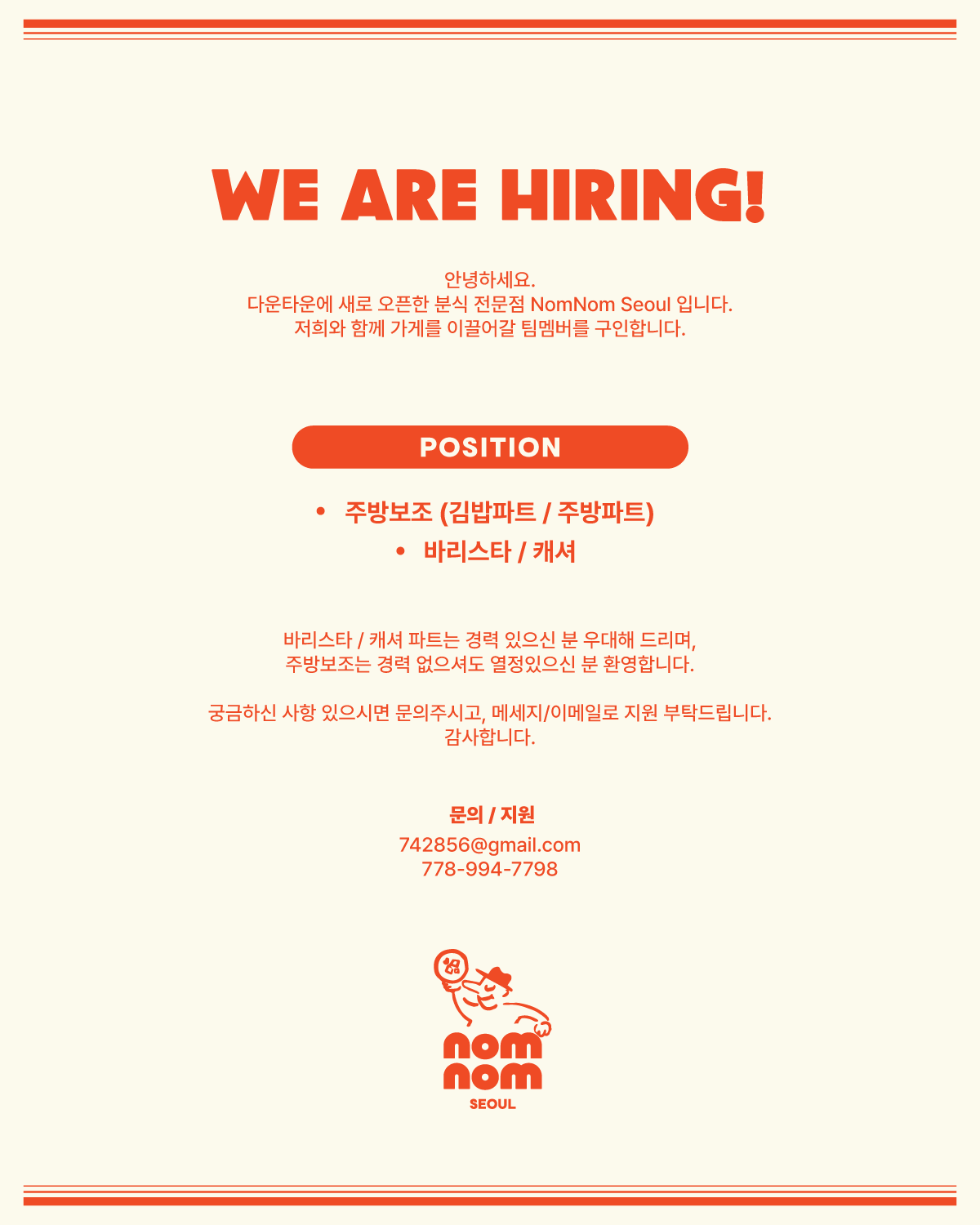 다운타운 새로 오픈한 NomNom Seoul에서 구인합니다. 작성자NC Company|작성시간24.02.08|조회수663 목록 댓글 0 글자크기 작게가 글자크기 크게가 다음검색 현재 게시글 추가 기능 열기 북마크 공유하기 신고 센터로 신고 댓글 댓글 0 댓글쓰기 답글쓰기 댓글 리스트