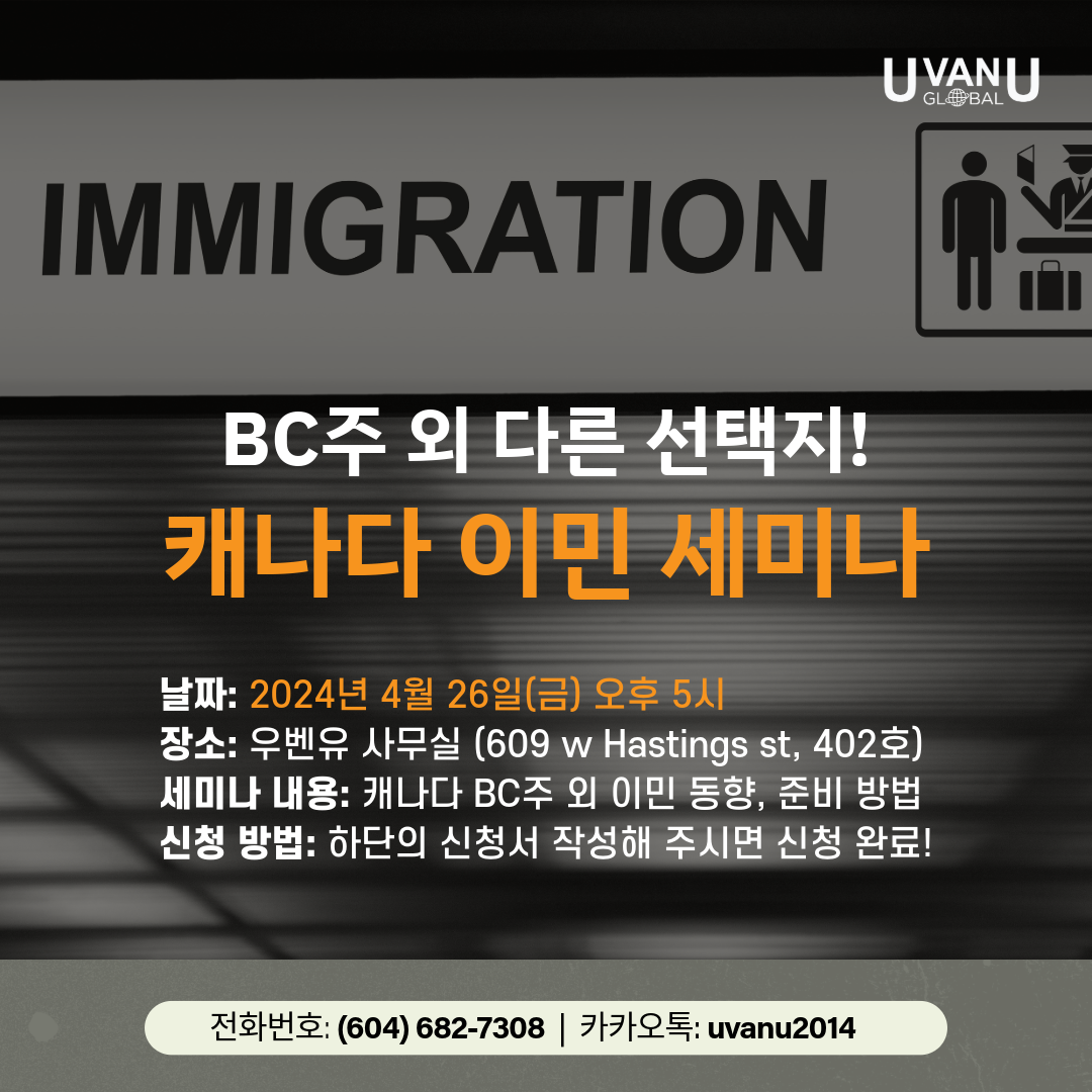 전화: 604-682-7308 | 카톡: uvanu2014 | 사무실: 609 W Hastings St, 402호 (워터프론트역 도보 3분)