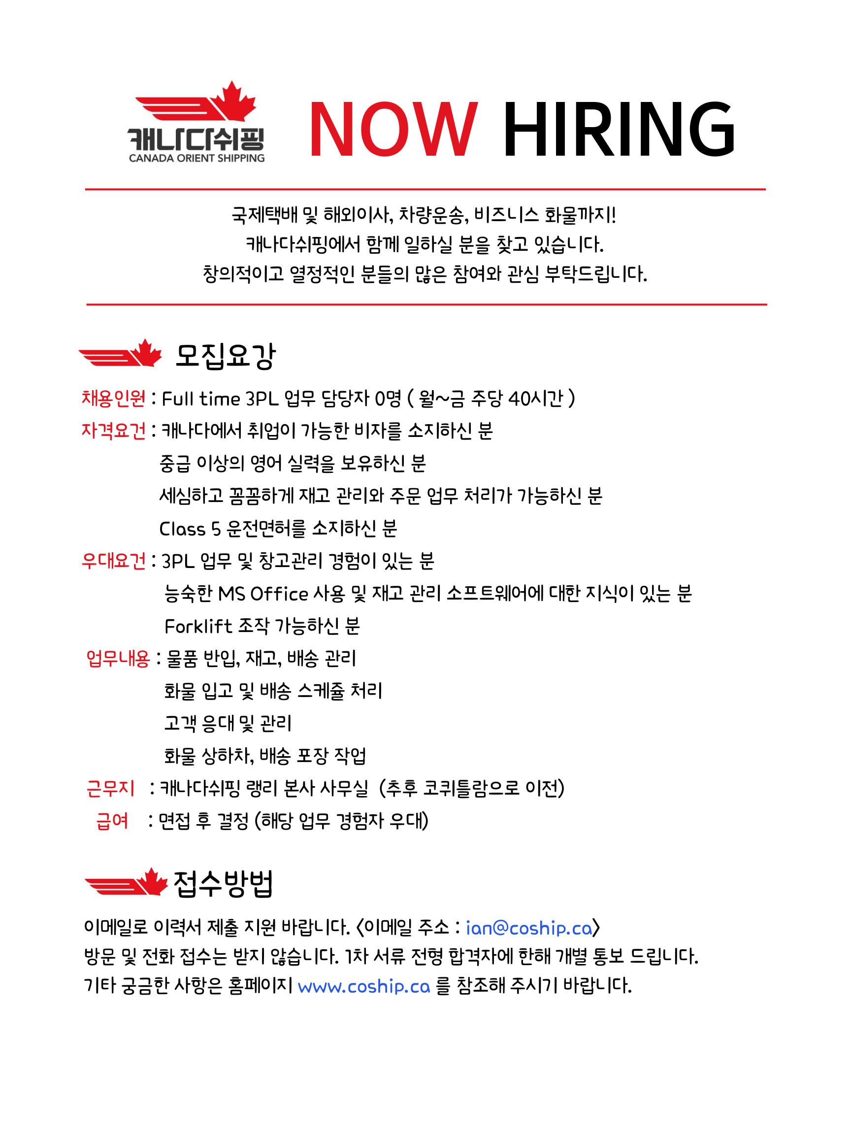 - 이메일 (ian@coship.ca)로 이력서를 제출해 주세요. 방문 및 전화 접수는 받지 않습니다.