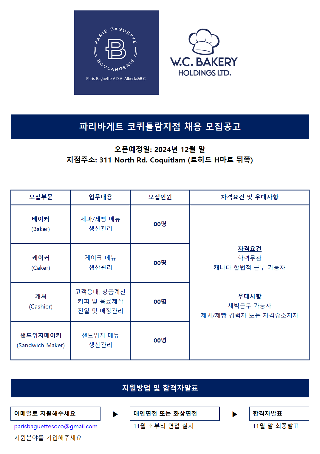 [스크랩] 12월 말 오픈예정 파리바게트 코퀴틀람지점 채용공고 - 베이커/케이커/캐쉬어/샌드위치메이커 작성자UvanU 광고팀|작성시간24.10.25|조회수483 목록 댓글 0 글자크기 작게가 글자크기 크게가 다음검색 스크랩 원문 : [UvanU] 우리는 벤쿠버 유학생 현재 게시글 추가 기능 열기 북마크 공유하기 신고 센터로 신고 댓글 댓글 0 댓글쓰기 답글쓰기 댓글 리스트