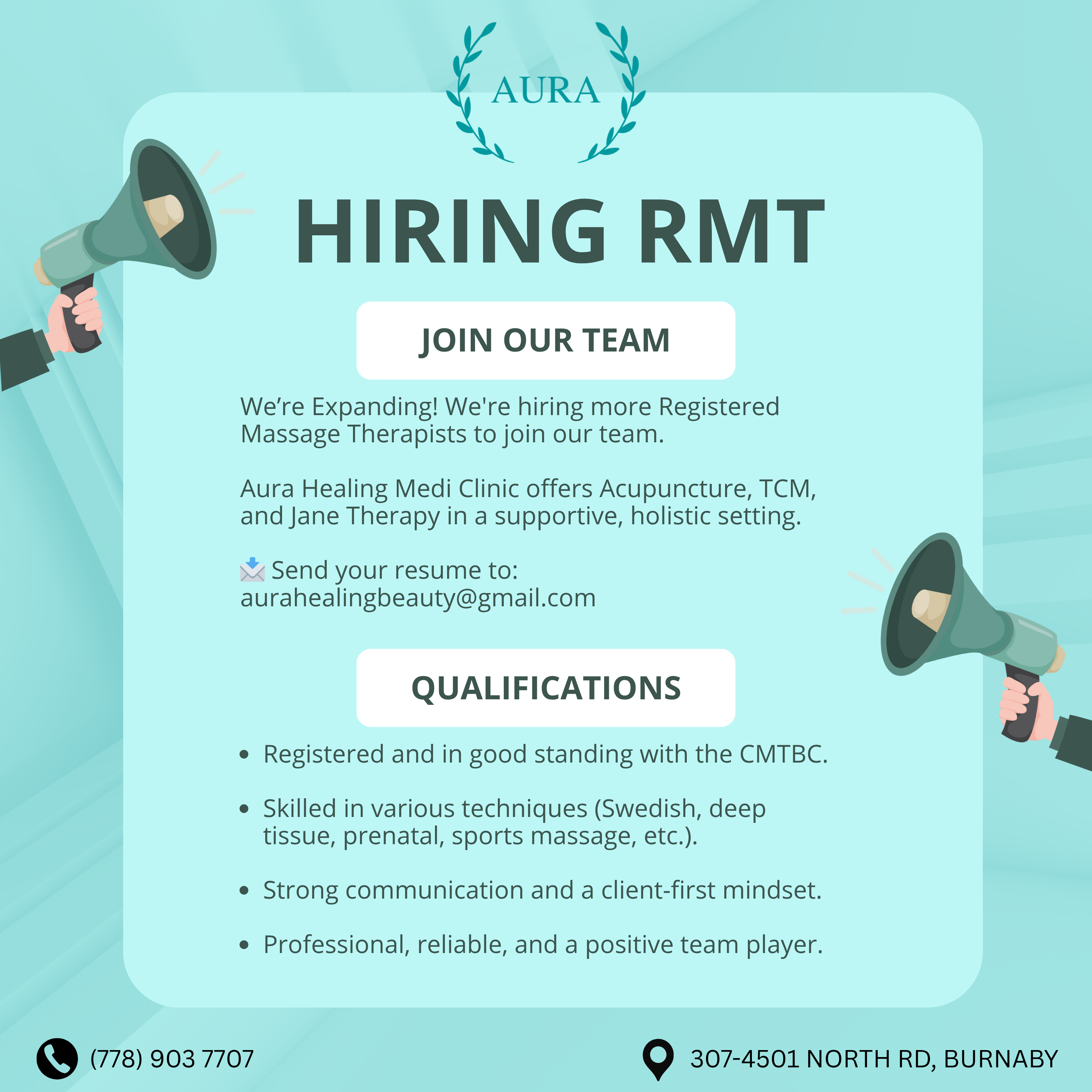 *******AURA 클리닉에서 함께 일하실 RMT 구합니다******** 작성자Aura h&b|작성시간25.07.24|조회수106 목록 댓글 0 글자크기 작게가 글자크기 크게가 🌿 오라 클리닉에서 함께 성장할 RMT를 모집합니다! 🌿오라 힐링 메디 클리닉이 확장됨에 따라Registered Massage Therapist (RMT) 선생님들을 새롭게 모십니다!✨ 경력자뿐 아니라 신규 RMT도 환영합니다.함께 성장하고 싶으신 분들의 많은 지원 바랍니다.📧 이력서 보내실 곳: aurahealingbeauty@gmail.com고객의 치유와 웰빙을 최우선으로 생각하는 저희 팀에 합류하세요! 다음검색 현재 게시글 추가 기능 열기 북마크 공유하기 신고 센터로 신고 댓글 댓글 0 댓글쓰기 답글쓰기 댓글 리스트