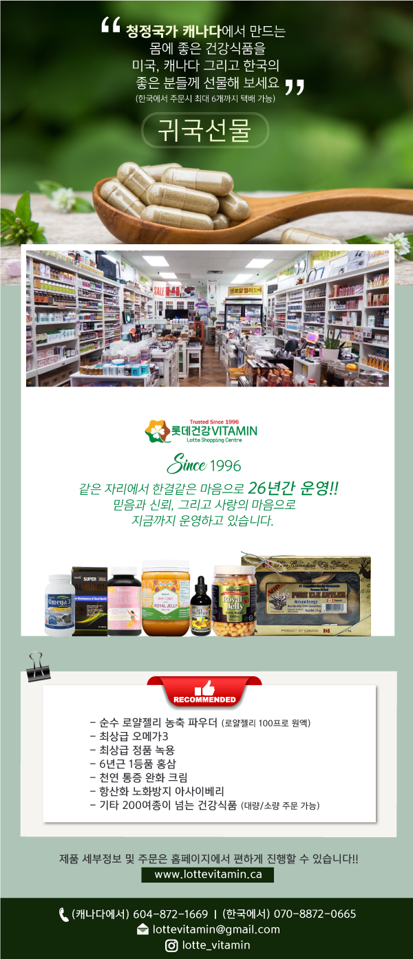 [롯데건강백화점] 청정국가 캐나다에서 만드는 몸에좋은 건강식품으로 '귀국선물' 준비하세요. 작성자cbmpress.com|작성시간22.03.04|조회수2,073 목록 댓글 0 글자크기 작게가 글자크기 크게가 ㅤㅤㅤㅤ"이미지를 클릭하시면 웹사이트로 이동 됩니다." ㅤㅤㅤㅤ 다음검색 현재 게시글 추가 기능 열기 북마크 공유하기 신고 센터로 신고 댓글 댓글 0 댓글쓰기 답글쓰기 댓글 리스트
