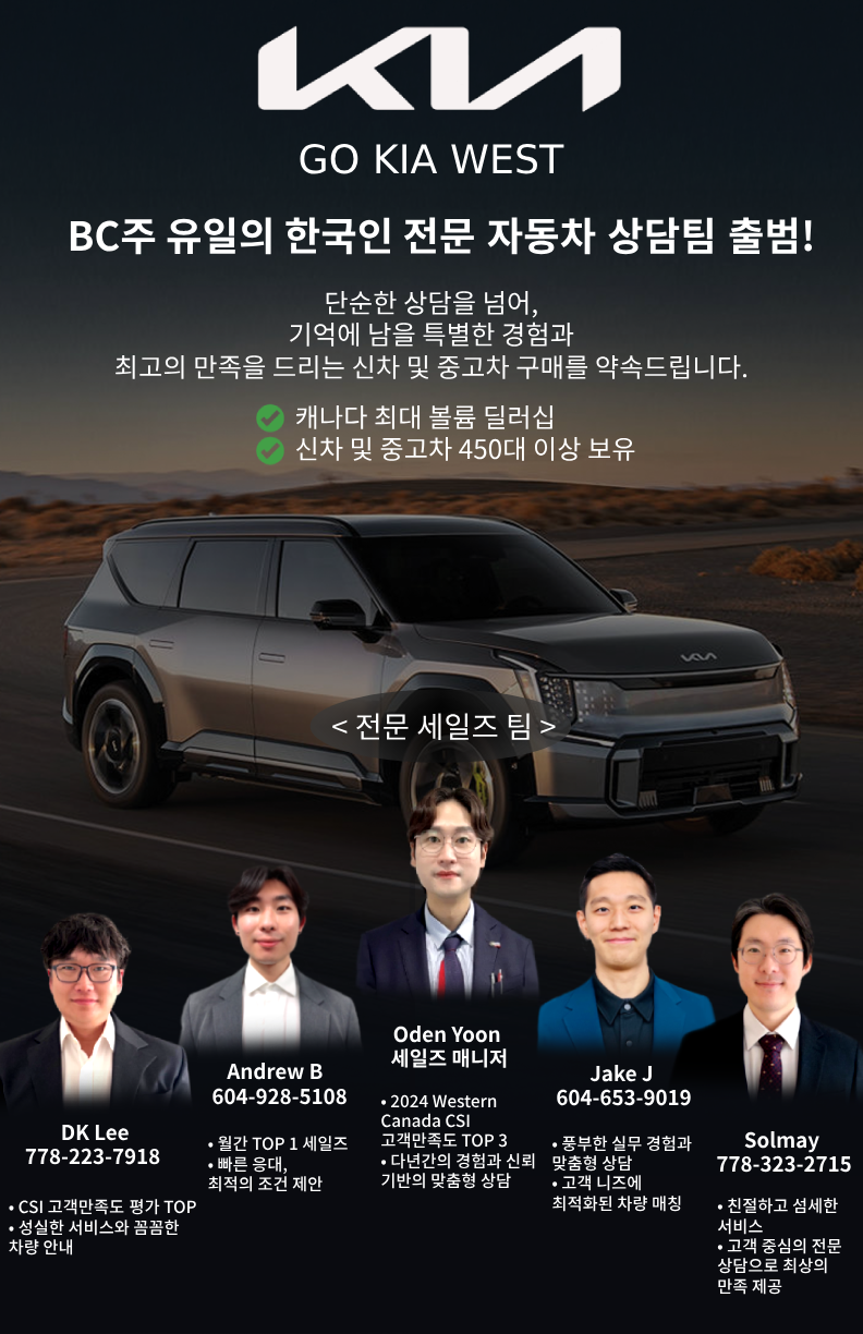 | [Go Auto KIA West] 자동차 세일즈 인원 모집 공고 모집 분야: 자동차 세일즈 / 판매 컨설턴트 모집 인원: 2명 근무지: [Coquitlam / Go Auto KIA West] 1. 모집 대상 학력: 고등학교 졸업 이상 경력: 경력자 우대, 신입도 지원 가능 자격 요건: 자동차에 대한 열정과 관심이 있는 분 고객과의 원활한 의사소통 능력을 갖춘 분 성실하고 책임감 있는 자세로 업무에 임할 수 있는 분 2. 담당 업무 고객에게 적합한 자동차 모델을 추천 및 판매 고객 상담 및 상담 기록 관리 차 판매 관련 업무 (계약 체결, 차량 인도, A/S 관리 등) 판매 목표 달성을 위한 전략적 접근 3. 근무 조건 급여: 커미션 4. 전형 절차 서류 전형 면접 (개별 인터뷰) 5. 지원 방법 이력서를 oyoon@kiawest.com 로 제출 KIA West Salesmanager Oden Yoon 778-201-1004 |