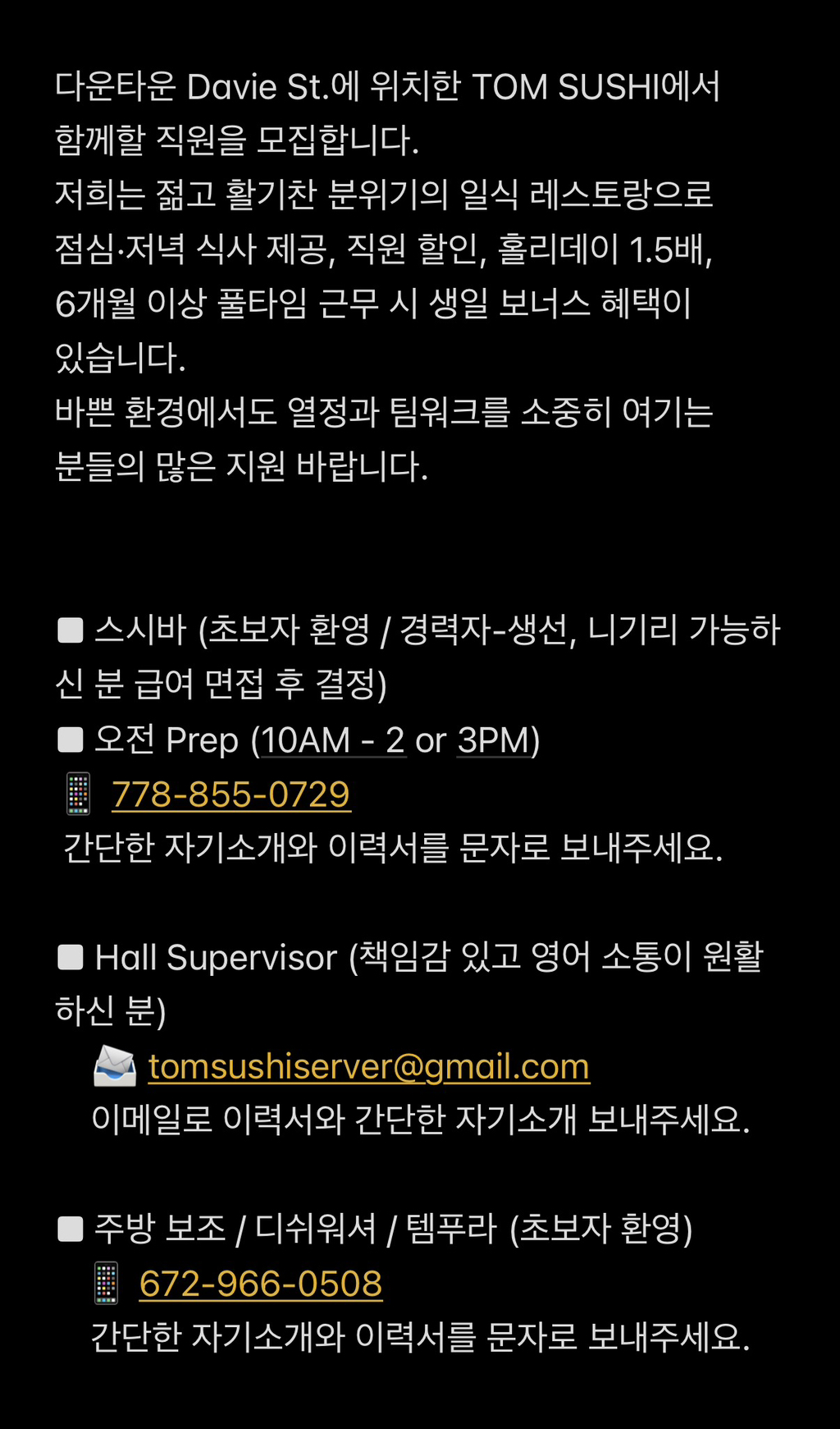 다운타운 TOM SUSHI 에서 같이 일하실 STAFF 구합니다✨ 작성자TOM SUSHI|작성시간26.02.14|조회수126 목록 댓글 0 글자크기 작게가 글자크기 크게가 다음검색 현재 게시글 추가 기능 열기 북마크 공유하기 신고 센터로 신고 댓글 댓글 0 댓글쓰기 답글쓰기 댓글 리스트