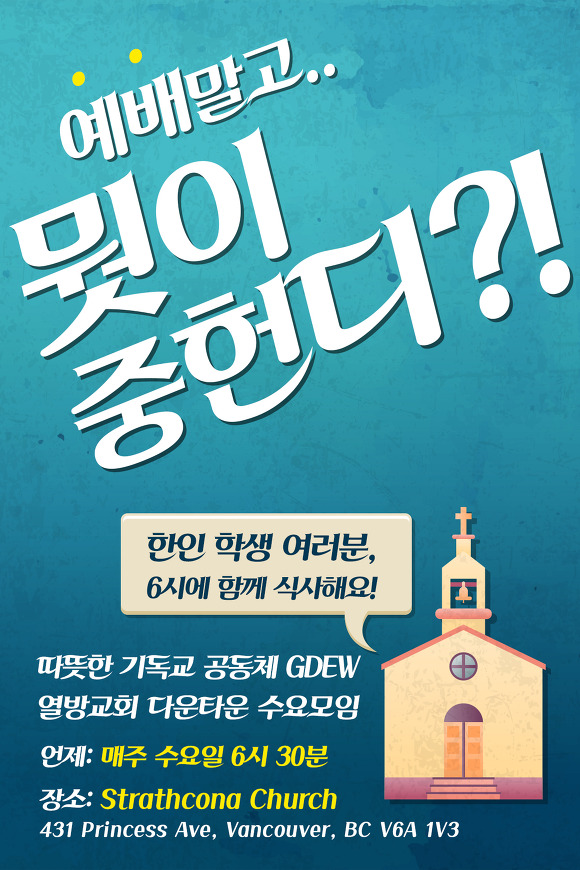 맛있는 식사와 함께 마음을 나누며 예배하는 예수 그리스도의 이름 아래 모이는 다운타운 수요모임에 여러분을 초대 합니다 ~~ [언제] 6시: 저녁식사 / 6시30분: 예배 [장소] Strathcona Church (431 Princess Ave, Vancouver) [연락처] Simba Sim (778-987-2597) |