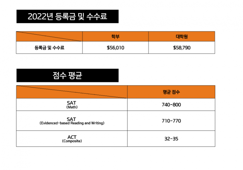 2022년 합격률은 6%, 졸업률은 98%로 통계되고 있으며 2021-2022년도 등록생의 56%가 SAT 점수를, 35%가 ACT 점수를 제출했습니다. 입학생의 SAT 평균 점수는 740-800(Math), 710-770(Evidenced-based Reading and Writing)이고 ACT 평균 점수는 32-35(Composite)입니다.