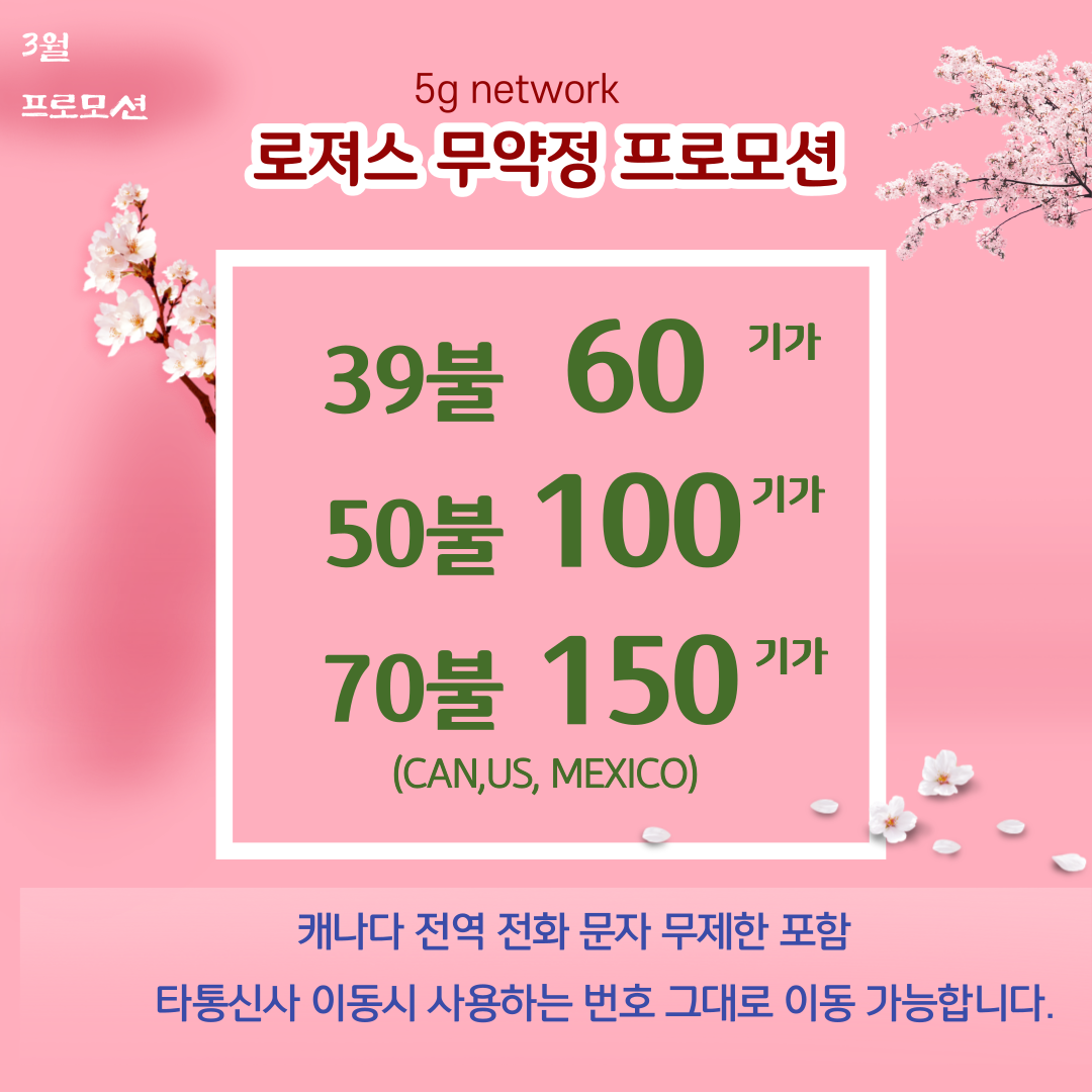 [유료광고]로져스 3월 promo 39불 60기가!! 60불 100기가(한국통화 1000분 통화 포함!) 특별할인 프로모션!
