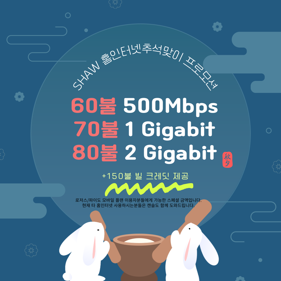 [유료광고]SHAW(샤) 홈 인터넷 초저가 추석 맞이 특가 세일중!60불 500mbps! 150불 빌크레딧까지 제공