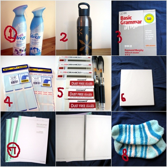 5. 샤프심 3개, 지우개 3개, 검정팬 두개 : 5불