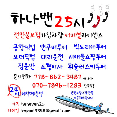 벤쿠버공항픽업 벤쿠버자유여행 벤쿠버한인택시 벤쿠버한인라이드 소형이사 가구조립 정크처리 가종메인터넌스..등 캐나다라이드★★하나밴25시 작성자룰루룰|작성시간25.05.26|조회수30 목록 댓글 0 글자크기 작게가 글자크기 크게가 다음검색 현재 게시글 추가 기능 열기 북마크 공유하기 신고 센터로 신고 댓글 댓글 0 댓글쓰기 답글쓰기 댓글 리스트