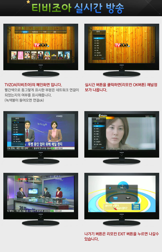 티비조아(TVZOA)는 언제 어디서나 인터넷만 통하면 TV로 즐길수 있는 고품격 영상서비스를 제공하며 실시간 한국방송은 물론 최신영화,드라마,예능,교육,스포츠,요리 등 다양한 프로그램을 더 쉽게 간편하게 즐길수 있는 제품입니다.