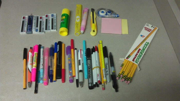 샤프심 6개, 딱풀, 자, 지우개, 칼, 포스트잇, 그리고 무수히 많은 펜 + 연필 입니다.