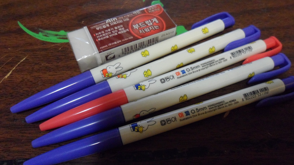 펜이랑 지우개입니다. 다 새거구요. 혹시 원하시면 제가 쓰던거 다른 색깔 펜들 몇개 좀 챙겨드릴게요.