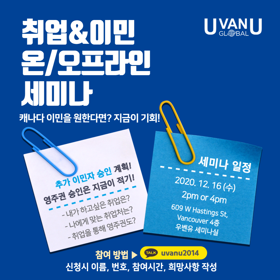[스크랩] [우벤유 세미나] 캐나다 취업 이민하고 싶은 사람 손~! 작성자UvanU-Dani|작성시간20.12.15|조회수34 목록 댓글 0 글자크기 작게가 글자크기 크게가 안녕하세요 우벤유입니다!캐나다에서 내가 원하는 취업처는?나에게 맞는 취업처는?취업 후 이민까지? 취업 후 이민에 관심있으신 분들이라면누구나 참여 가능한 온/오프라인 세미나!지금 바로 신청해 주세요:)[참여방법] 아래 오픈채팅으로 성함, 연락처, 원하시는 세미나(오/ 오프라인 중)를 보내주세요~!클릭▼ 다음검색 스크랩 원문 : [UvanU] 우리는 벤쿠버 유학생 현재 게시글 추가 기능 열기 북마크 공유하기 신고 센터로 신고 댓글 댓글 0 댓글쓰기 답글쓰기 댓글 리스트