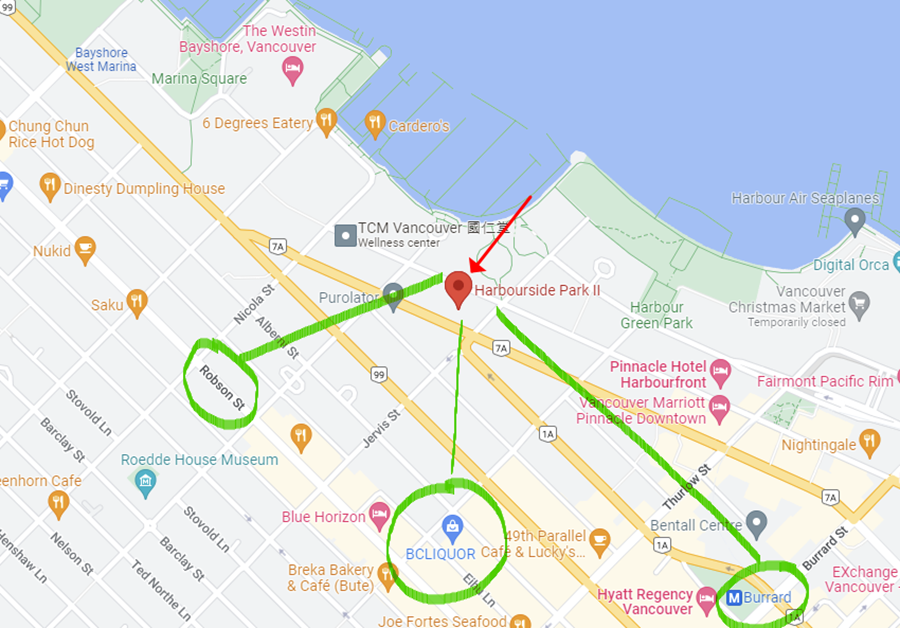 구글맵 기준, 다운타운 한남마트 도보5분, 버라드역 도보8분, Robson St. 으로의 접근성 엄청 좋구요, 근처에 JJ bean, Starbucks, Shoopers, BC Liquor , 7-Eleven 등의 편의 시설이 도보로 5-7분 거리에 위치해 있습니다.