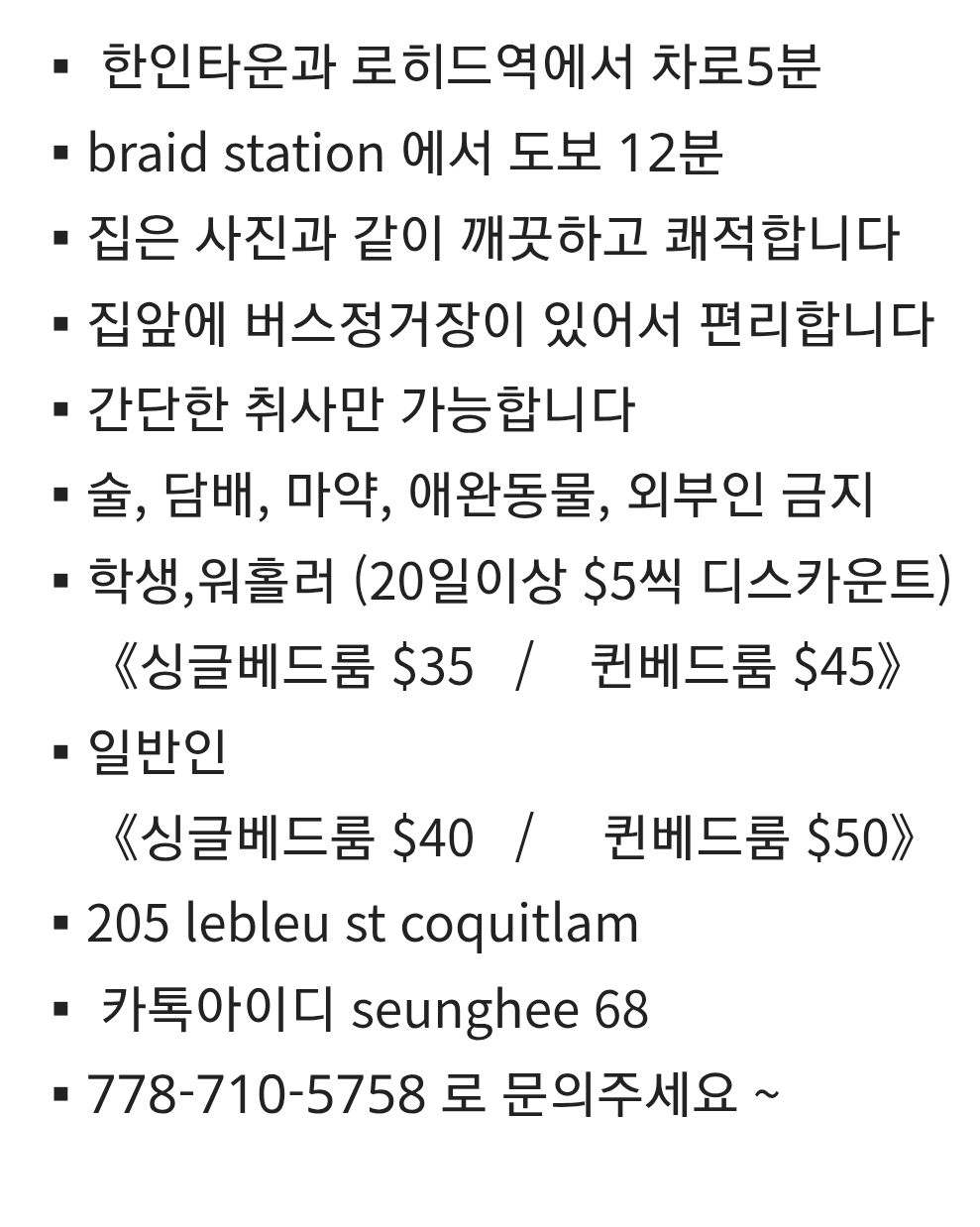 한인타운 [ 임시숙소,룸렌트 ] 작성자Seunghee|작성시간25.12.04|조회수32 목록 댓글 1 글자크기 작게가 글자크기 크게가 ▪︎룸렌트 $750 $850 다음검색 현재 게시글 추가 기능 열기 북마크 공유하기 신고 센터로 신고 댓글 댓글 1 댓글쓰기 답글쓰기 댓글 리스트 해당 댓글은 작성자와 운영진만 볼 수 있습니다. 댓글 전체보기