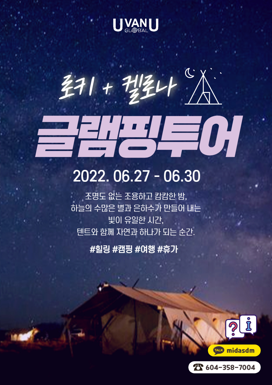 로키+켈로나 3박4일 글램핑 투어 신청 또는 관련 문의는