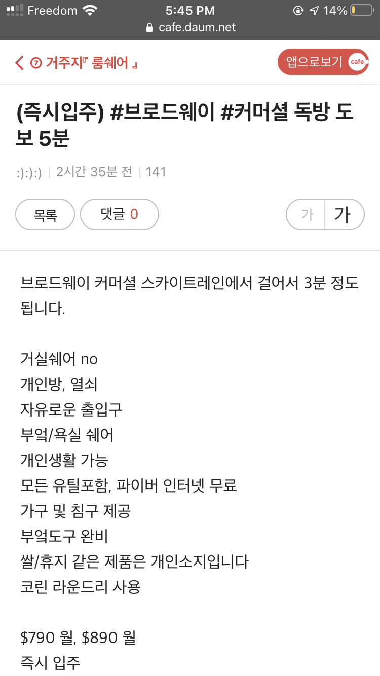 저는 8월 1일에 입주 조건으로 1875 east 12th ave (아래에도 바로 렌트글 또 올리셨네요 참..) 의 집 주인과 단기렌트를 맺고