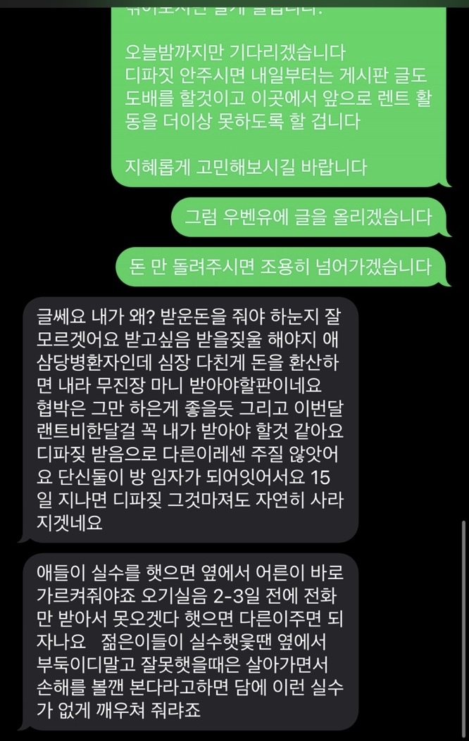 저희는 너무 당황한 채 그곳에서 나와 재차 디파짓을 돌려달라고 하였으나 전화를 받지 않으시고는 문자로 오히려 한달치 월세를