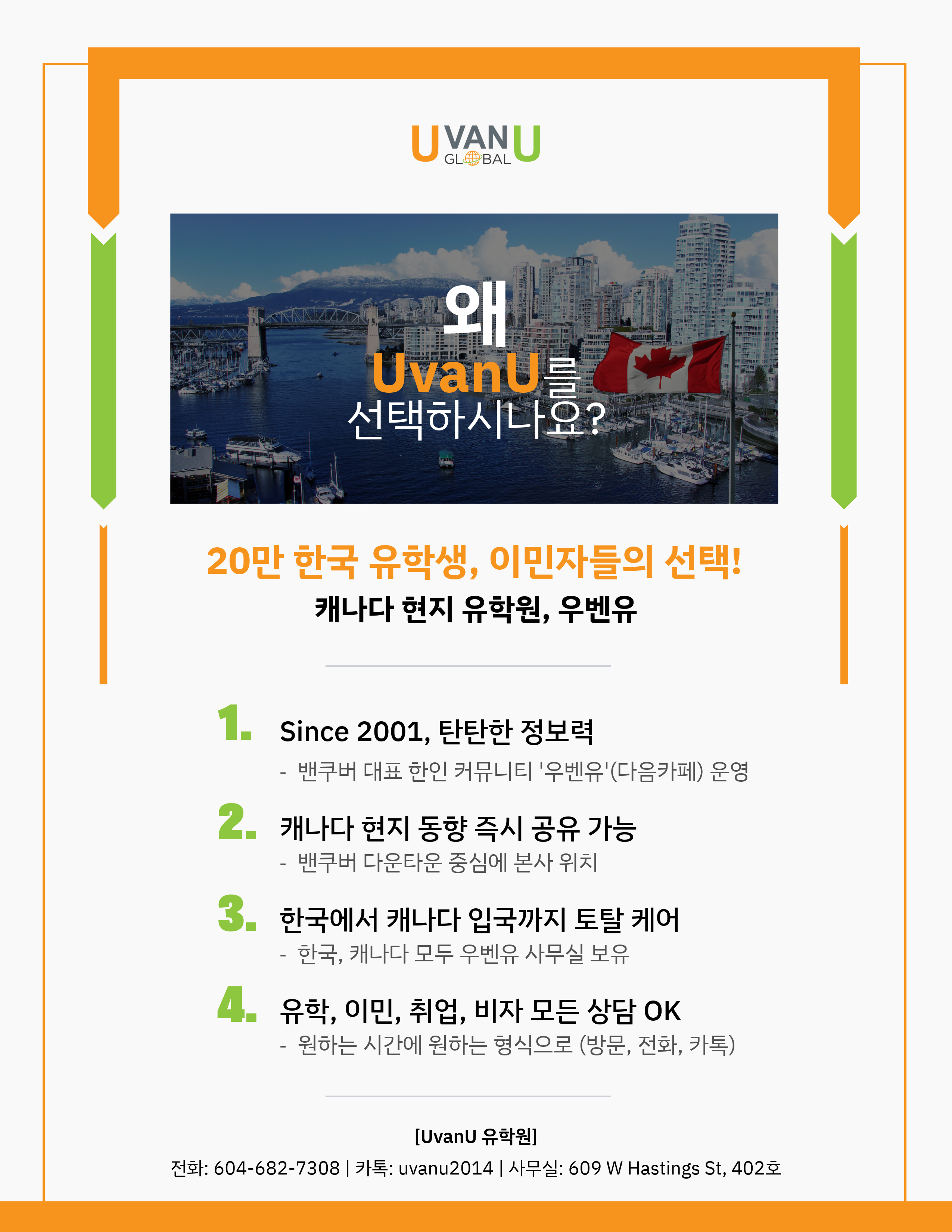 전화: 604-682-7308 | 카톡: uvanu2014 | 사무실: 609 W Hastings St, 402호 (워터프론트역 도보 3분)