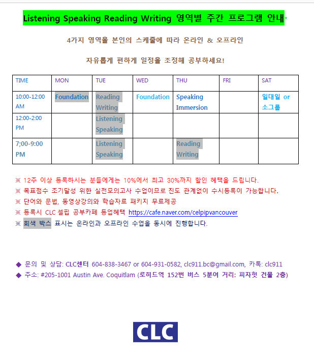 ※ 등록시 CLC셀핍 공부카페 등업혜택 https://cafe.naver.com/celpipvancouver