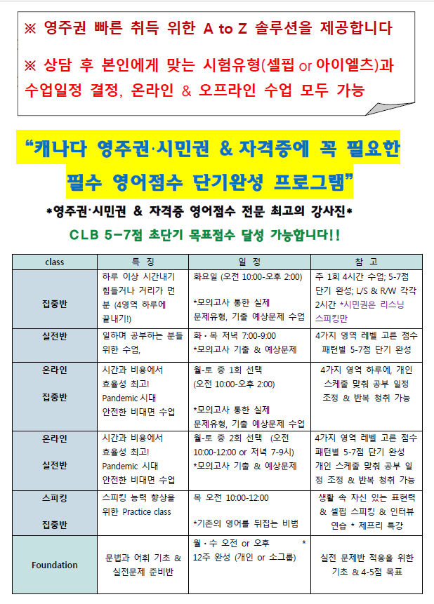 “캐나다 영주권·시민권 & 자격증에 꼭 필요한필수 영어점수 단기완성 프로그램”
