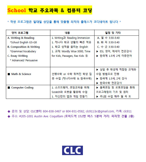 ◆ 문의 및 상담: CLC센터 604-838-3467 or 604-931-0582, clc911.bc@gmail.com, 카톡: clc911