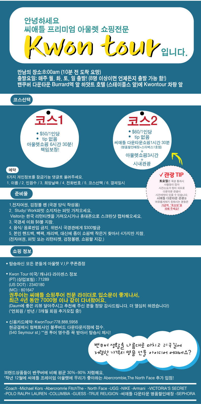$$$ (권투어)*당일치기! 지금 연말연시 쎄일기간임!!!씨애틀 아울렛 전문(코스1,코스2)///**씨애틀쇼핑 안가는 날엔 휘슬러 관광(그냥 설경관광 만!) 작성자♥권투어|작성시간14.12.27|조회수37 목록 댓글 0 글자크기 작게가 글자크기 크게가 다음검색 현재 게시글 추가 기능 열기 북마크 공유하기 신고 센터로 신고 댓글 댓글 0 댓글쓰기 답글쓰기 댓글 리스트