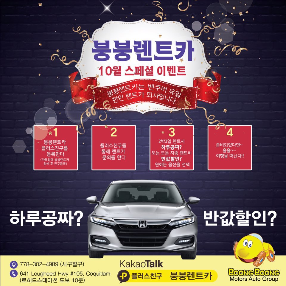 캐나다 한인 유일 렌트카 회사 붕붕렌트카! 10월 하루 렌트비 $20 부터!! 작성자BoongBoong Rent Car|작성시간18.10.31|조회수244 목록 댓글 0 글자크기 작게가 글자크기 크게가 안녕하세요. 캐나다 유일 한인 렌트카 붕붕렌트카입니다.저희 붕붕렌트카에서 10월 이벤트를 준비합니다. 1. 2박3일 렌트시 하루는 공짜!2. 모든 차종 종류에 상관없이!! 렌트비 50% 할인 합니다!!모든 문의 사항은 저희 붕붕렌트카 카카오 플러스 친구 등록 후 문의 해주세요^^렌트카 문의 778-302-4989 카카오톡 : bbrentcar4989 다음검색 현재 게시글 추가 기능 열기 북마크 공유하기 신고 센터로 신고 댓글 댓글 0 댓글쓰기 답글쓰기 댓글 리스트