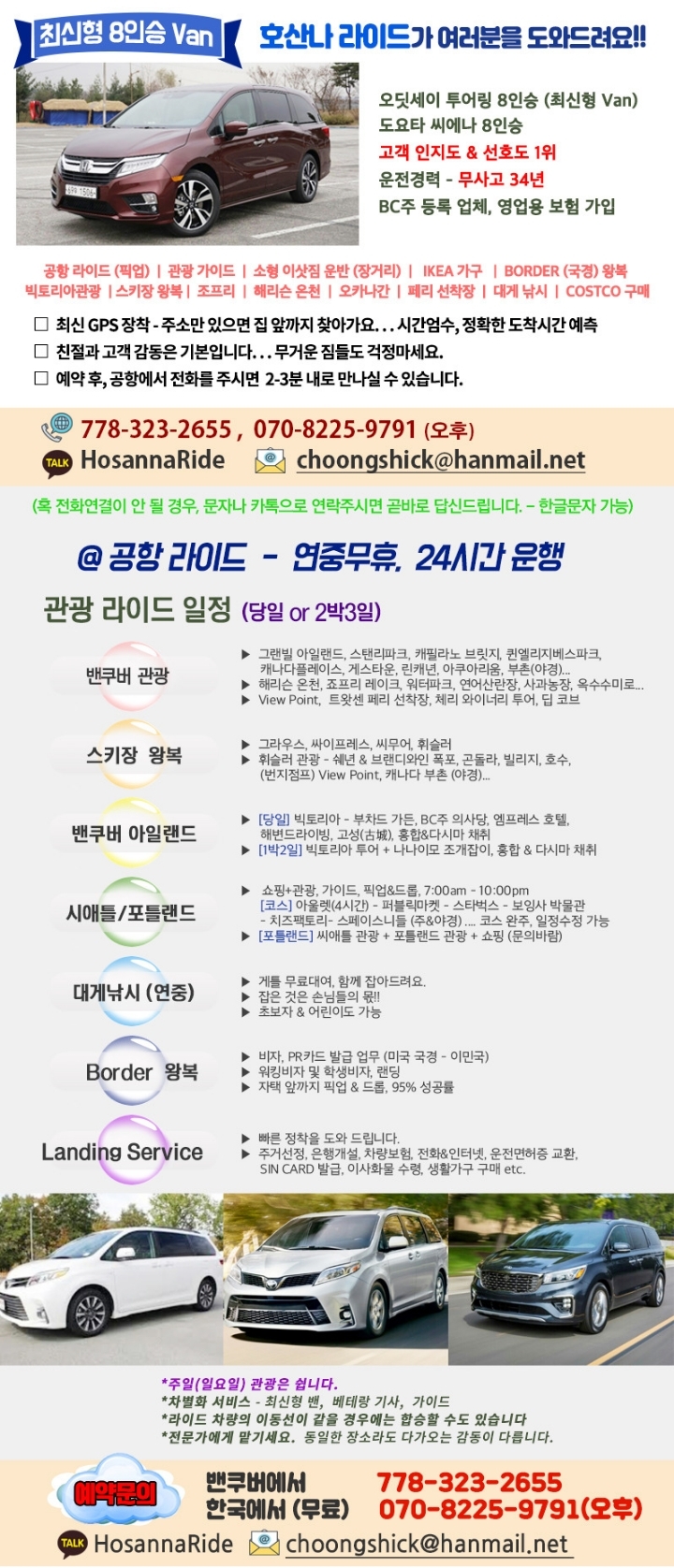 작성자♡ 호 산 나 라 이 드 ♡작성시간20.08.18조회수53 목록 댓글 1호산나 라이드... 밴쿠버 공항픽업, 밴쿠버 공항라이드, 씨애틀 공항(타코마) pick up, 밴쿠버 택시 한인택시 한인라이드 밴쿠버 콜밴 라이딩 라이더 & 포틀랜드 우드번 아울렛 & 씨애틀 관광(아울렛 쇼핑) & 빅토리아 & 휘슬러 & 해리슨 온천 & 밴쿠버 시내관광 & 워터파크 & 죠프리 레이크 & 체리유픽, 블루베리 유픽 & 대게잡이 & 트왓슨 페리 선착장, 이삿짐, IKEA 가구(침대,쇼파), 국경왕복(보더), 정착랜딩 써비스 ... 778-323-2655 .... 감사해요 !!