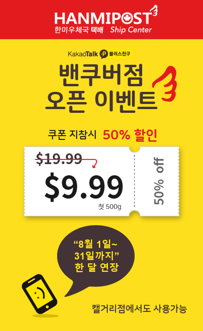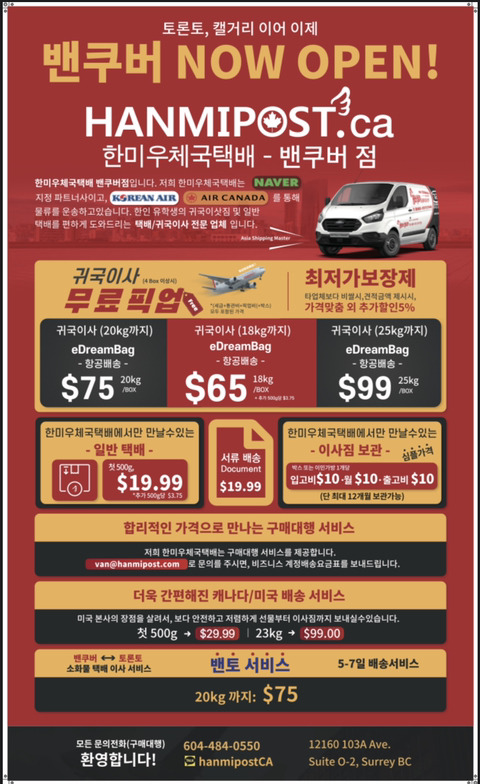 [한미우체국택배] 밴쿠버 지점 오픈 이벤트! 4-5일항공배송/$9.99택배/18kg귀국이사$65/전지점직영운영/정직한택배