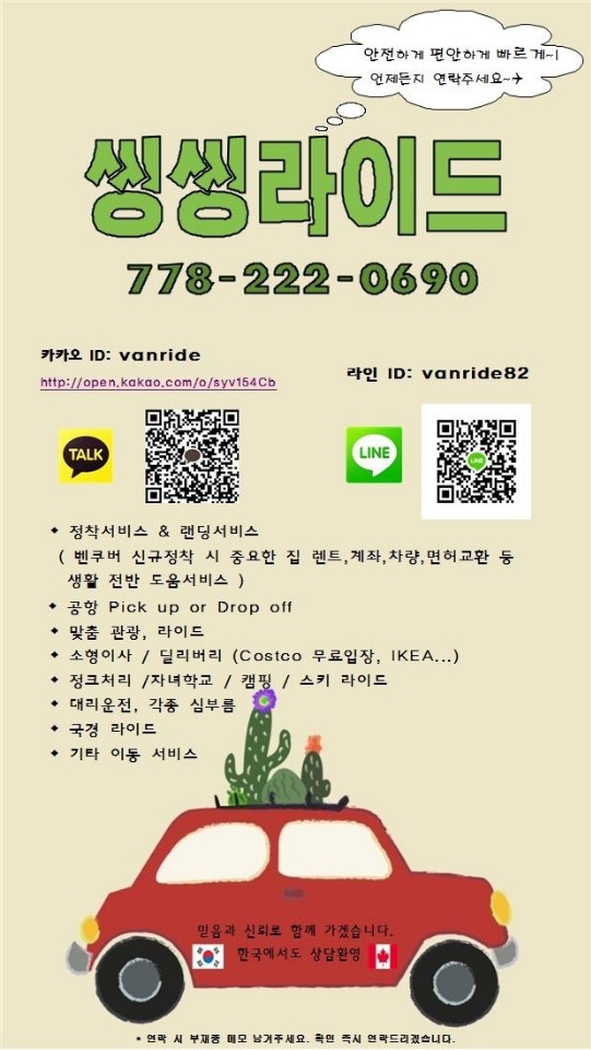 씽씽! costco 학교ikea픽드랍 공항 정크 소형이사 심부름 관광 시내투어 대게잡이!!랜딩서비스해리슨 록키 조프리 트와슨 휘슬러 빅토리아등 BC주 안에서 이동 타주이동 이사등등 언제든 연락주세요!!! 778-222-0690 카톡 vanride 상담환영
