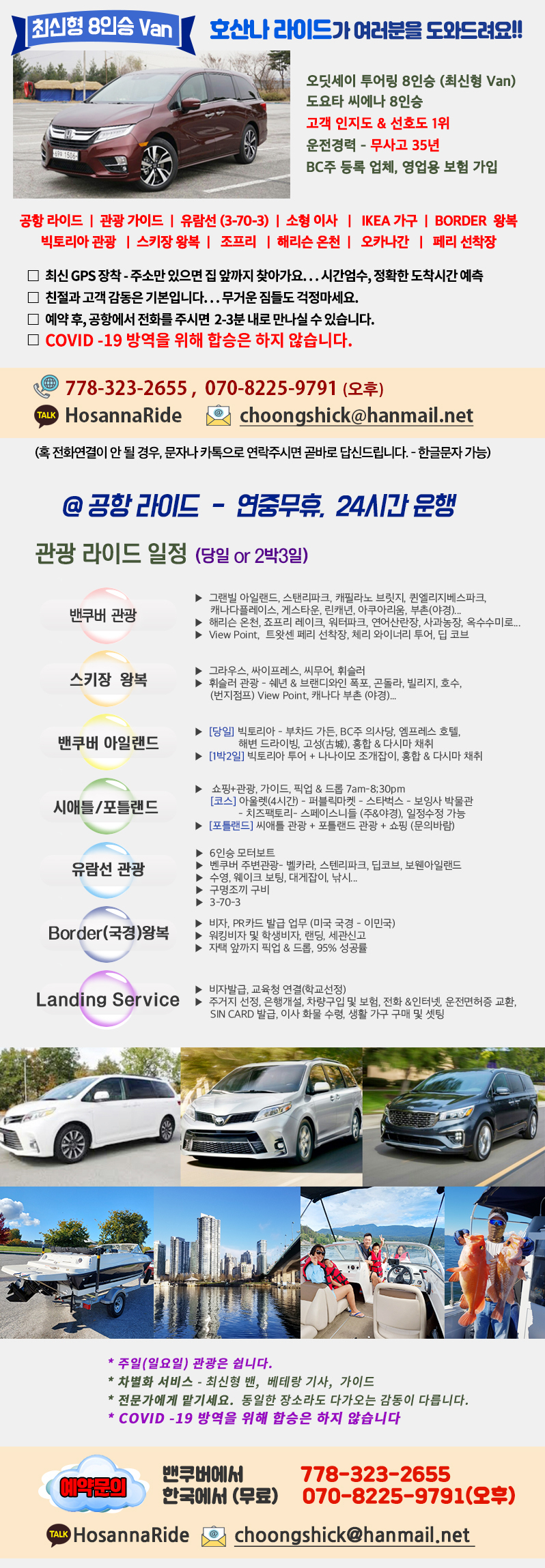 [생활정보]¹● 인지도 1위 ▶ 공항픽업 - 밴쿠버관광 - 휘슬러 조프리 해리슨 빅토리아 소형이사 IKEA - 페리 보더 778-323-2655