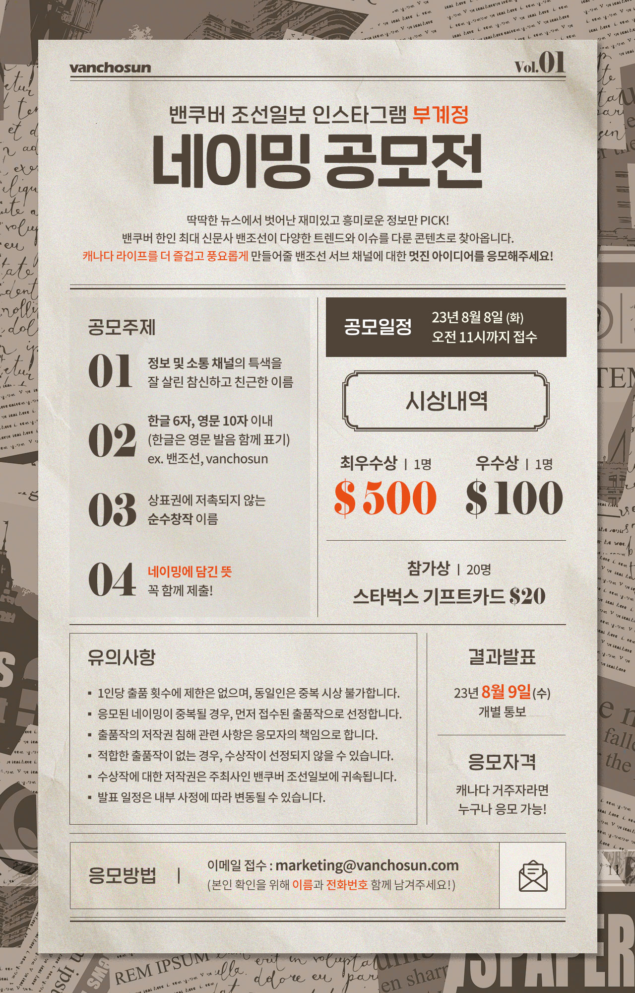 [정보공유]밴쿠버 조선일보 인스타그램 부계정 네이밍 공모전 작성자밴쿠버 조선일보|작성시간23.07.29|조회수44 목록 댓글 0 글자크기 작게가 글자크기 크게가 안녕하세요 밴쿠버 조선일보입니다 딱딱한 뉴스에서 벗어나 재미있고 흥미로운 정보만 PICK!밴쿠버 한인 최대 신문사 밴조선이 다양한 트렌드와 이슈를 다룬 콘텐츠로 찾아옵니다.캐나다 라이프를 더 즐겁고 풍요롭게 만들어줄 밴조선 서브 채널에 대한멋진 아이디어를 응모해주세요! 자세한 내용은 공모전 포스터를 참고해주세요.감사합니다 본계정 인스타그램: @vanchosun ㅤㅤㅤㅤㅤㅤㅤㅤㅤㅤㅤㅤㅤㅤㅤㅤㅤㅤ 다음검색 현재 게시글 추가 기능 열기 북마크 공유하기 신고 센터로 신고 댓글 댓글 0 댓글쓰기 답글쓰기 댓글 리스트