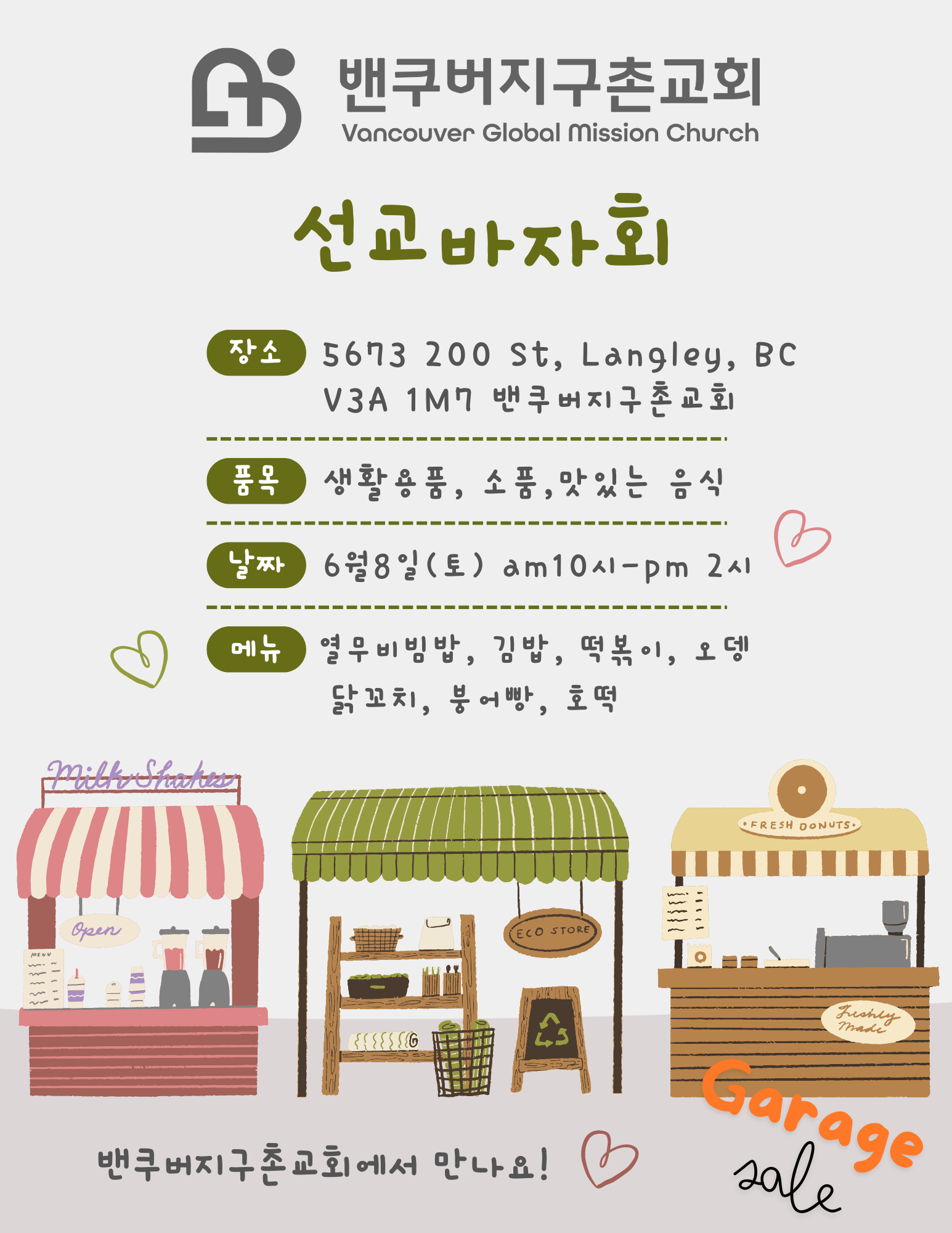 밴쿠버 지구촌교회 선교바자회 작성자Min87|작성시간24.06.01|조회수158 목록 댓글 0 글자크기 작게가 글자크기 크게가 ㅤㅤㅤㅤㅤㅤ밴쿠버 지구촌교회에서 선교바자회를 진행합니다!풍성한 먹거리와 물품이 준비되어있습니다. 여러분 모두를 초대합니다!^^모든 수익금은 코스타리카 단기선교와 원주민 선교에 사용됩니다. 일시: 6월8일(토) 10am-2pm장소: 밴쿠버 지구촌 교회 5673 200st, Langleyㅤㅤㅤㅤㅤㅤㅤㅤ 다음검색 현재 게시글 추가 기능 열기 북마크 공유하기 신고 센터로 신고 댓글 댓글 0 댓글쓰기 답글쓰기 댓글 리스트