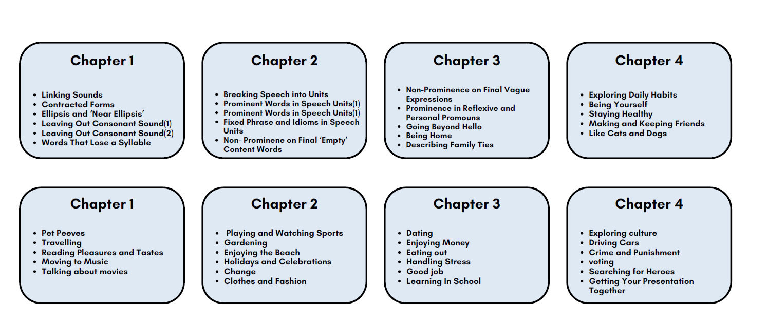 | 장점 | 1. Pronunciation & Speech Rhythm Training - 영어 말하기의 흐름을 만드는 소리 연결 및 축약 표현 집중 훈련으로 듣기 쉬운 발음 +자연스러운 속도와 억양 완성 2. Topic-Based Speaking Practice - 실생활 및 사회적 주제를 활용한 단계별 스피킹 연습을 통해 다양한 상황에서도 막힘없이 말하는 능력 강화 3. Fluency & Natural Expression Practice - 고정 표현, 관용어, 실제 회화에서 자주 쓰이는 말하기 패턴 학습으로 문장 영어가 아닌 말하는 영어 습득 4. Presentation & Structured Speaking - 발표 상황에 필요한 말하기 구조와 전달력 훈련으로 학업, 업무, 발표까지 연결 가능한 스피킹 역량 완성 |