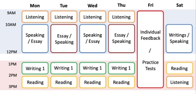 • Listening, Reading, Writing(Task 1, Task 2), Speaking 전과목에 대한 매일 학습