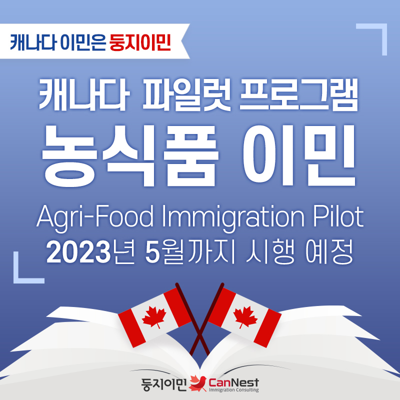 μ΄μ μΊλλ€ λμν μ΄λ―Ό νμΌλΏ, Canada Agri-Food Immigration Pilotμ λν΄μ μμ보μμ΅λλ€. ν΄λΉ νλ‘κ·Έλ¨μ νμΌλΏ νλ‘κ·Έλ¨μΌλ‘ 2023λ 5μκΉμ§ μνμ΄ μμ λμ΄ μμ΅λλ€.