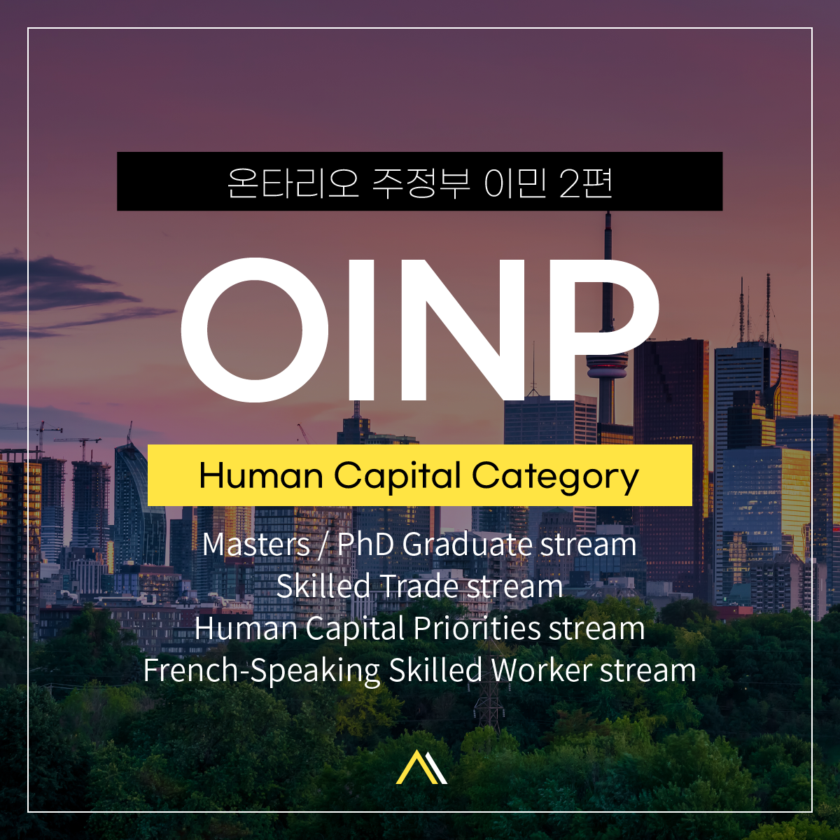 온타리오 주정부 이민은 크게 Employer Job Offer / Human Capital / Business 이렇게 3개의 카테고리로 나뉘는데요, 오늘은 고용주의 잡 오퍼가 필요 없는 Human Capital Category에 대해 살펴보겠습니다.