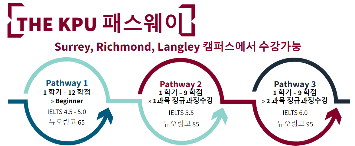 공립 대학교다 보니 컬리지에 비해 요구하는 영어 점수가 높은데요, 조건을 충족하지 못하더라도 KPU 자체에서 운영하는 조건부 입학 프로그램을 통해 영어수업을 먼저 들으실 수 있습니다. 영어 실력에 따라 수강해야 하는 기간이 달라지는데요, Pathway 2부터는 전공수업도 함께 수강할 수 있어 시간을 절약할 수 있습니다.