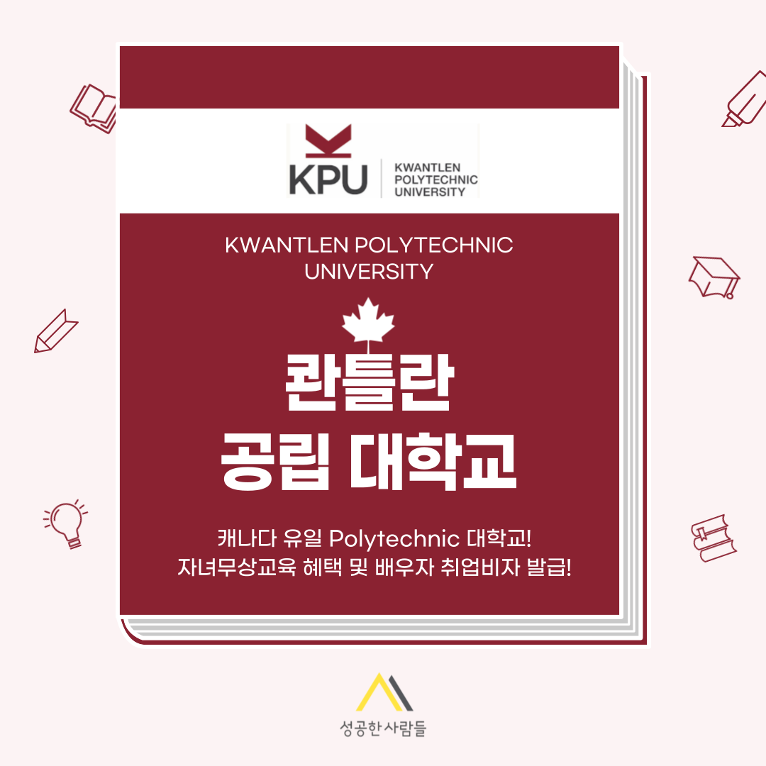 오늘은 유학 후 이민까지 계획할 수 있는 PGWP가 발급되어 배우자 오픈워크퍼밋 및 자녀무상교육까지 가능한 KPU에 대해 알아보았습니다. 졸업 후 취업에 특화된 KPU에 관심 있으신 분들은 언제든지 성공한사람들로 문의하세요💚