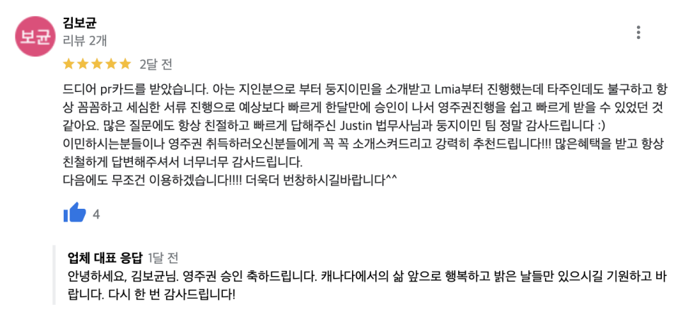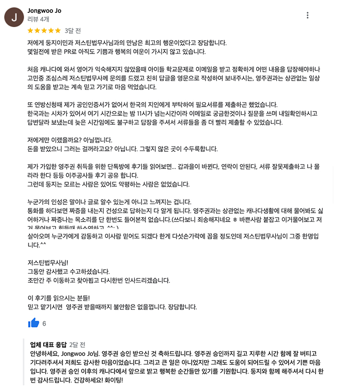 500๊ฐ ์ด์์ ์ด๋ฏผ ํ๊ธฐ๋ Express Entry๋ฅผ ํตํ ์์ฃผ๊ถ ์น์ธ, PNP ํ๋ณด์ ์ ์ ํ Express Entry๋ก ์์ฃผ๊ถ ์น์ธ, AAIP๋ BC PNP๋ฅผ ํตํ ๋ฐฉ๋ฒ ๋ฑ ๋ค์ํ ๊ฒฝ๋ก๋ฅผ ํตํ ์ฑ๊ณต์ฌ๋ก๋ฅผ ๋ค๋ฃจ์์ต๋๋ค. ๋ชจ๋ ์ ๋ง๋ค์ ์ํฉ์ ๋ง๊ฒ ๊ณํ์ ์ง ์ ์ฒญํด ์ป์ ๊ฒฐ๊ณผ์ธ๋ฐ์. ๊ฐ์์ ๊ณ ๋ฏผ์ ๊ฐ๊ณ ๋ฐฉ๋ฌธํด ์ฃผ์ ๊ณ ๊ฐ๋ถ๋ค๊ป ๋ง์กฑ์ค๋ฌ์ด ์๋น์ค๋ฅผ ์ ๊ณตํ ์ ์์๋ค๋ ๊ฒ์ ํฐ ๊ธฐ์จ์ ๋๋๋๋ค. ์ ๋ขฐ๋ก ๋งก๊ฒจ์ฃผ์๊ณ , ํจ๊ป ํ๋ฉด ์ธ์ ๋ ์ข์ ์ฑ๊ณผ๊ฐ ๋ฐ๋ผ์ฌ ๊ฒ์ด๋ผ๋ ๋ฏฟ์์ด ์์ต๋๋ค.
