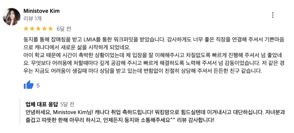 ๋ฅ์ง์ด๋ฏผ์ ํตํด ์ก๋งค์นญ ํ LMIA๋ฅผ ํตํ ์ํฌํผ๋ฐ์ ๋ฐ์ ์บ๋๋ค์์ ๊ทผ๋ฌด ์ค์ด์ Ministove Kim ๋์ ๋ฆฌ๋ทฐ์ ๋๋ค. ํนํ ์์ด๋ค ํ๊ต ๋ฑ๋ก ๋ฌธ์ ๋ก ์ํฌํผ๋ฐ ๋ฐ๊ธ ์๊ธฐ๊ฐ ์ค์ํ๋๋ฐ์. ๋ฑ ๋ง์ถ์ด ์งํ๋์ด ์ ํฌ๋ ๊ณ ๊ฐ๋๋ ๋ฌด์ฒ ๊ธฐ๋ปค๋ ์ผ์ด์ค๋ก ๊ธฐ์ตํฉ๋๋ค.
