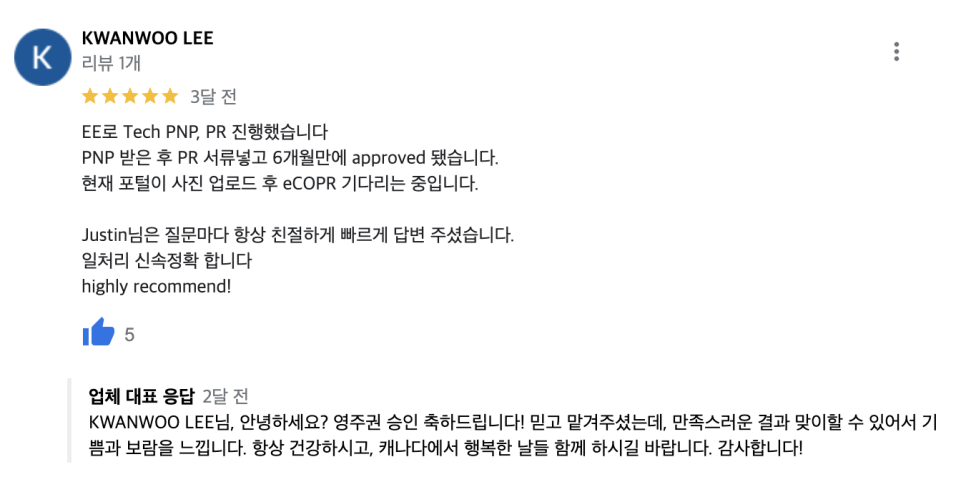 KWANWOO LEE ๋์ ์ฃผ์ ๋ถ PNP ํ๋ณด ์ ๋ฐ ์ดํ, Express Entry๋ก ์์ฃผ๊ถ ์น์ธ์ ๋ฐ์ ์ผ์ด์ค์ธ๋ฐ์. BC PNP Tech๋ฅผ ํตํด ๋น ๋ฅด๊ฒ ์ฃผ์ ๋ถ ์ด์ฒญ์ฅ์ ๋ฐ์ ์ฌ์ฌ๊ฐ ์งํ๋์๊ณ , ๋ ์ด๋ฅผ ํตํด Express Entry๋ฅผ ์งํํด ์๋ฅ ์ ์ ํ 6๊ฐ์ ๋ง์ ์์ฃผ๊ถ์ ์น์ธ๋ฐ๊ฒ ๋์์ต๋๋ค.